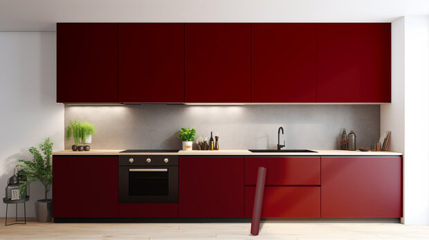 Plakfolie bordeaux rood is dé folie voor het decoreren van je tafelblad, je stoelpoten, je binnendeuren en kasten! Je bestelt dit donkerrode folie eenvoudig op maat bij Plakfoliewebshop!
