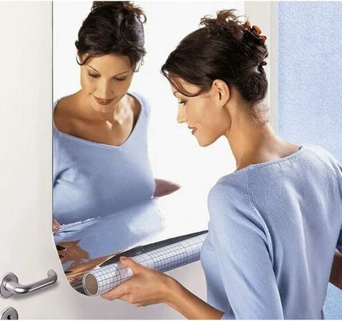 Plakfolie met een spiegel effect. Ideaal voor het creëren van plakspiegels op gladde muren, panelen, deuren of andere objecten. Het spiegelfolie werkt echt als een spiegel. Het is ook dik folie dat eenvoudig zonder luchtbellen is aan te brengen.