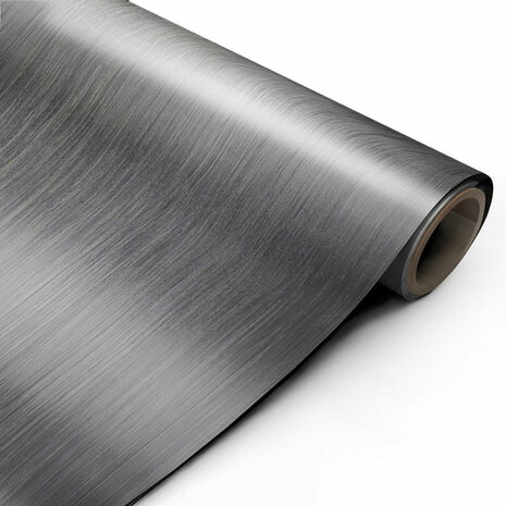 Dit folie heeft een donkergrijze, geborstelde rvs look. De lijnen zijn voelbaar op het folie. Het folie is donkergrijs, maar als je er met een lamp op schijnt en ook buiten in de zon ziet het folie er een stuk lichter uit.