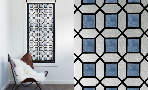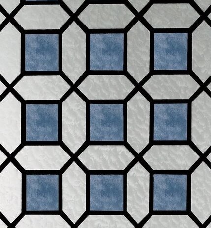 Raamfolie met een blauw glas in lood effect. Vermindert de doorkijk. De breedte is 45cm, de lengte kies je zelf.