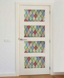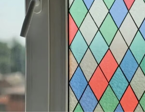 glas in lood raamfolie! Een mooi zelfklevende folie met kleurrijk ruitpatroon. De afmetingen van de gekleurde ruitjes zijn 10,5 cm x 6 cm, met 3 mm zwarte omlijning. De glas in lood folie werkt goed tegen inkijk in huis. Om je een idee te geven: Je ziet er bijvoorbeeld nog wel een bloemenvaas doorheen die pal achter het folie op de vensterbank staat, maar alles dat zicht 50cm of verder van het raam bevind, zie je niet meer. Heb je Hr++ of Hr+++ glas? Dan kun je dit folie alleen gebruiken op ramen die constant in de schaduw staan.