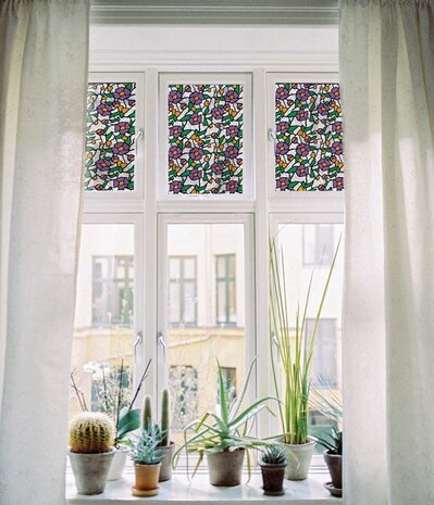 Raamfolie met een glas in lood bloem effect. Vermindert de doorkijk en zorgt voor meer sfeer. De breedte is 45cm, de lengte kies je zelf.