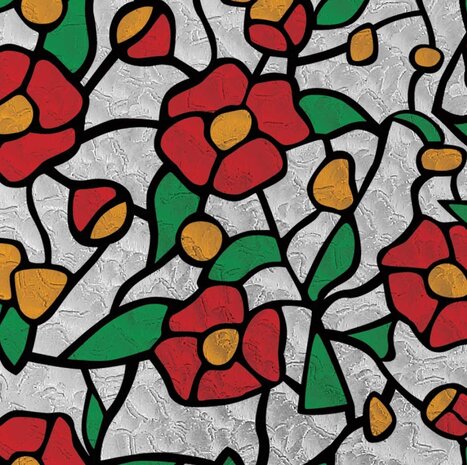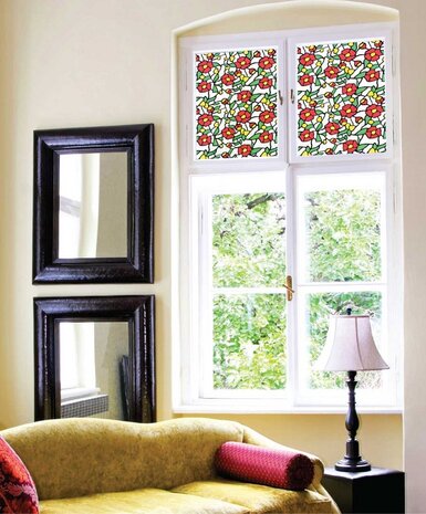 glas in lood raamfolie! Een mooi zelfklevende folie met rode en gele bloemen De glas in lood folie werkt goed tegen inkijk in huis. Om je een idee te geven: Je ziet er bijvoorbeeld nog wel een bloemenvaas doorheen die pal achter het folie op de vensterbank staat, maar alles dat zicht 50cm of verder van het raam bevind, zie je niet meer. Heb je Hr++ of Hr+++ glas? Dan kun je dit folie alleen gebruiken op ramen die constant in de schaduw staan.